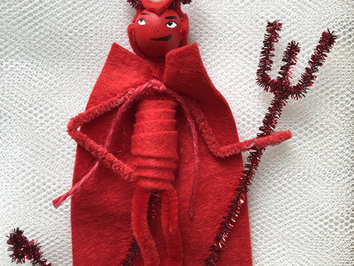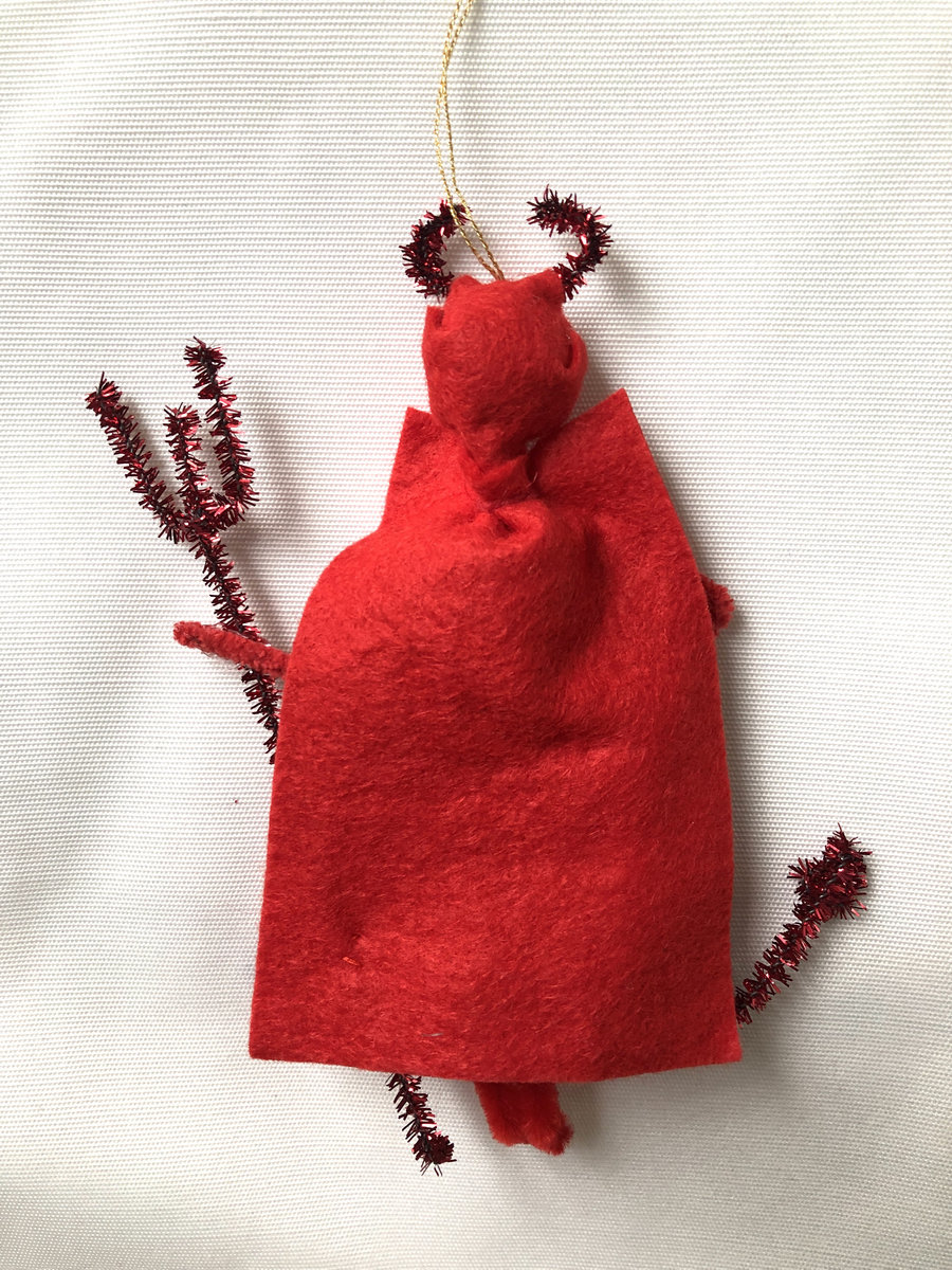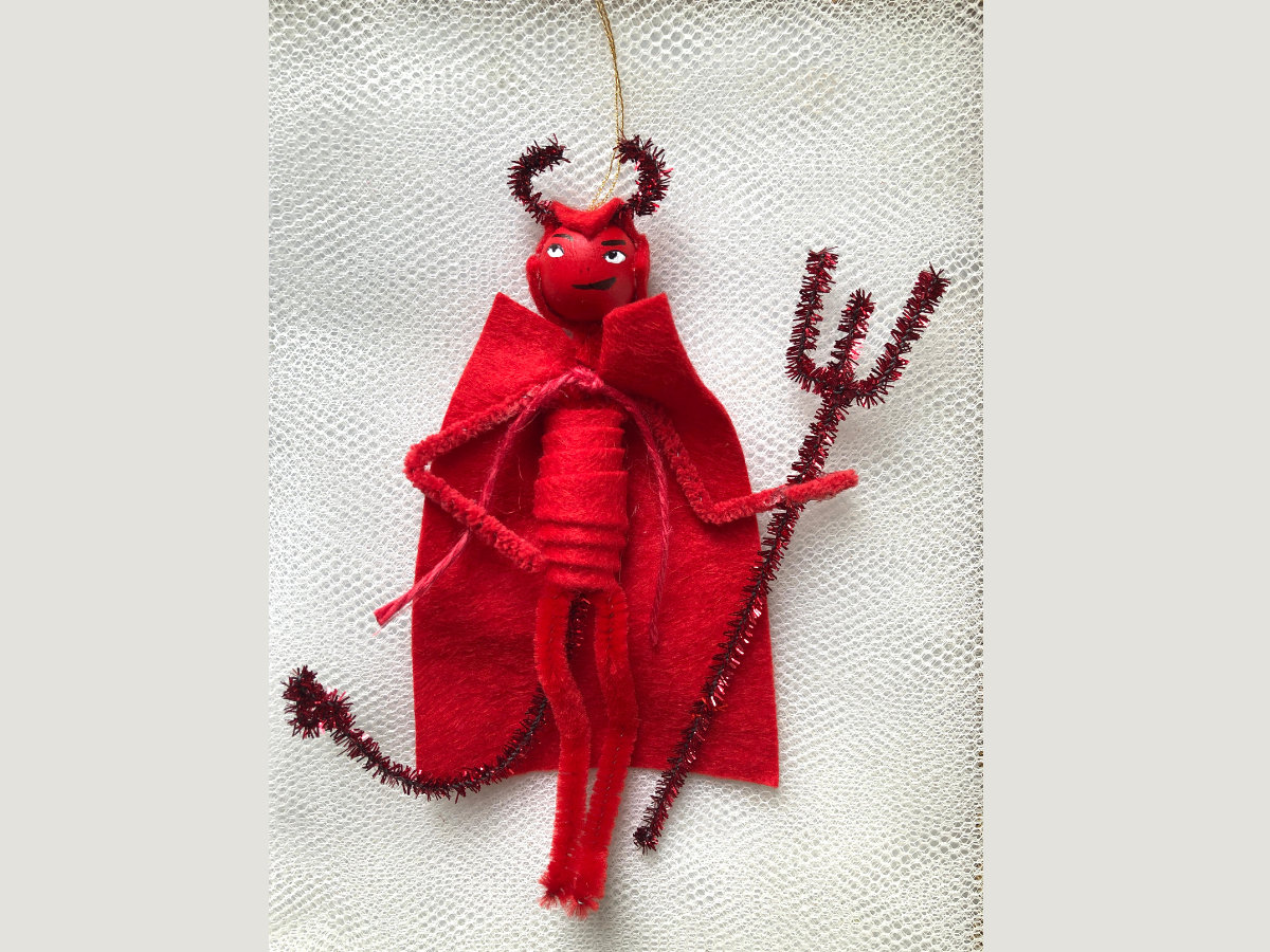 This vintage-style ornament is inspired by age-old iconography of Krampus and the Devil—the latter never misses the New Standards holiday show. He is crafted from felt and pipe cleaners; his head is a hand-painted wooden bead. 6” tall.
